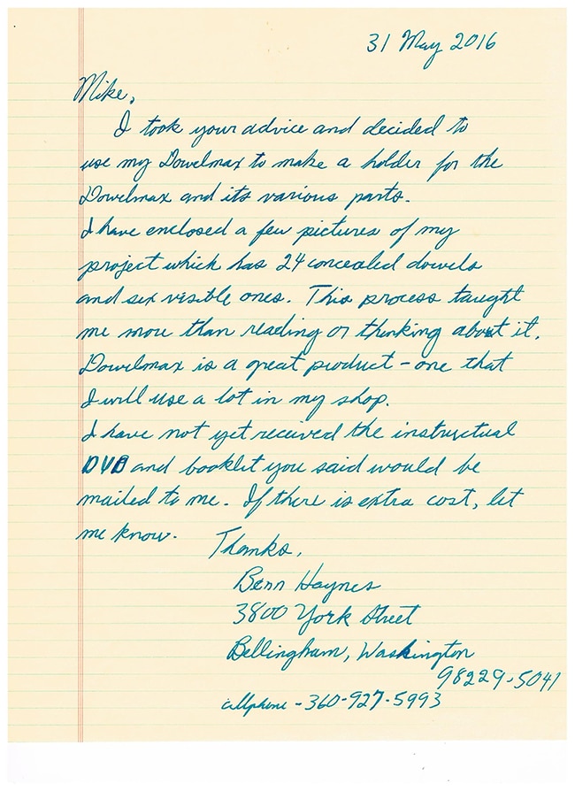 It isn’t often that I write a review or contact a company about their product, but because of your exceedingly superior quality tool, the Dowelmax Jig and your personal customer service I feel compelled to write this letter to you.