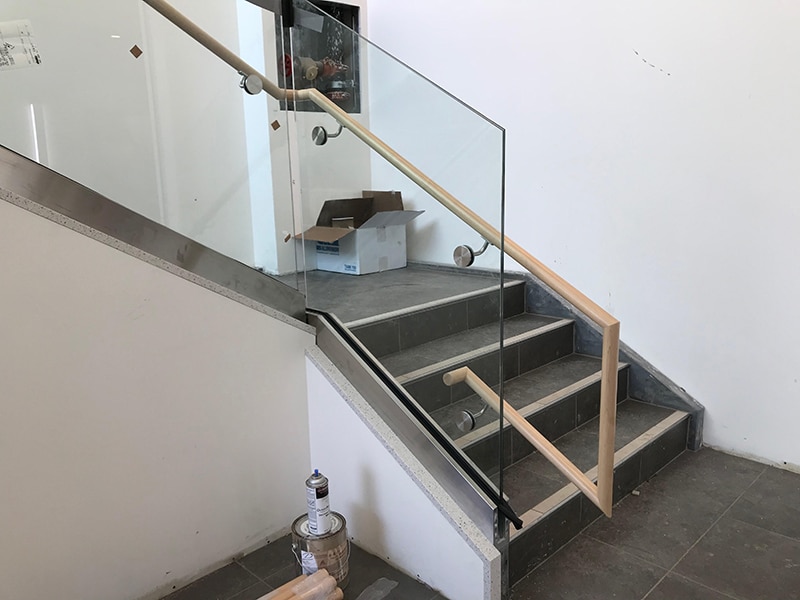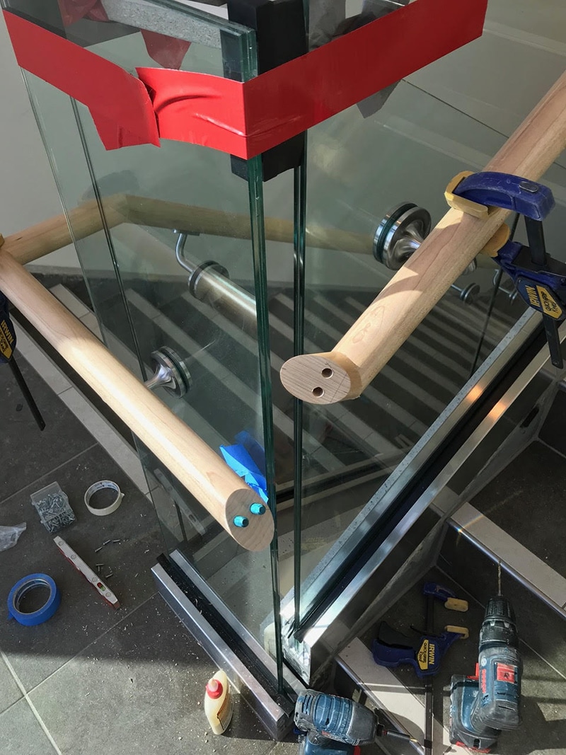 I needed to install some round 1-1/2” maple hand railing onto glass vertical risers while helping to stabilize the glass with the railing including the corner sections and between each panel on three flights of stairs.