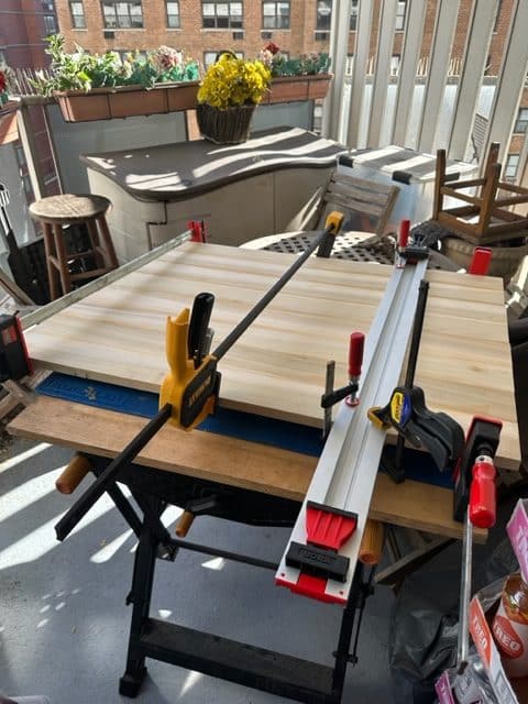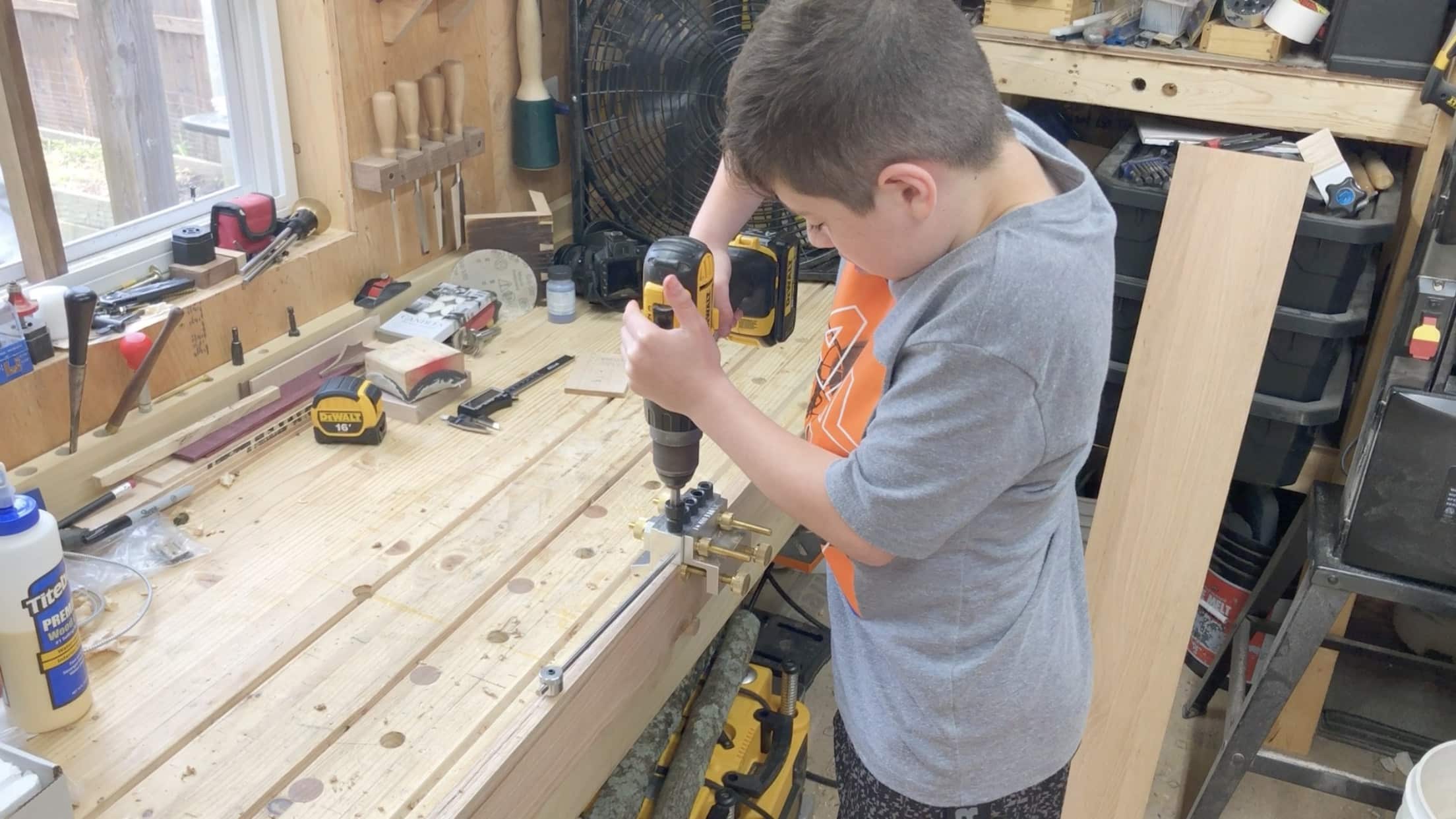 Hunter A. using Dowelmax to edge join long boards in A-Z’s Tiny Woodshop.