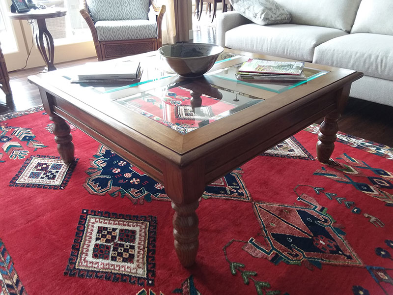 This article describes how to design and build a large coffee table, in cherry wood, with turned 4 x 4 legs and beveled glass panels on top. I strongly prefer furniture built from solid wood, and I seldom use plywood except for drawers. For years, I persevered with alder, which is a beautifully grained wood, but also a nightmare to stain. I then progressed to cherry, which is a beautiful wood, not hard on the tools, and can be nicely stained if prepared properly.