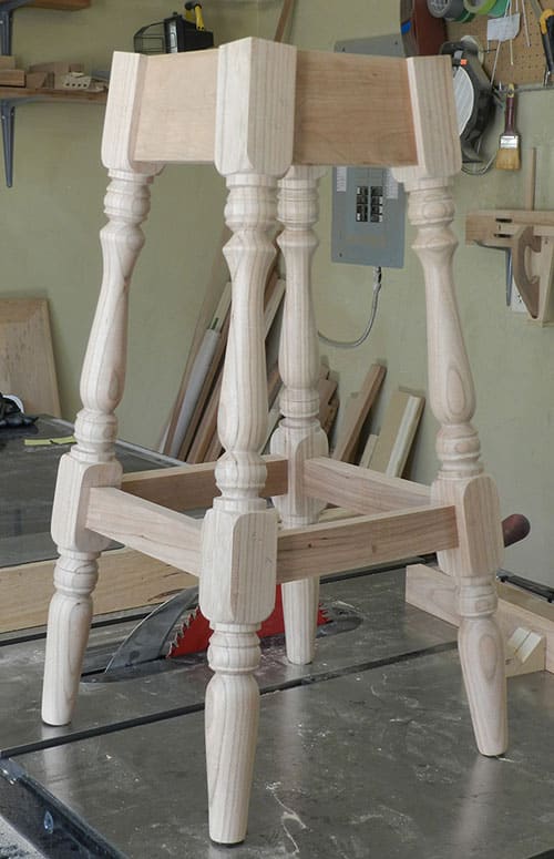 I am using solid cherry for the 4 legs used to build the stool frame assembly, each measuring 1 3/4 x 1 3/4 x 25 inches. Mill the sides of the legs carefully to ensure these are straight and true. The legs should be identical in length and the cross cuts square. I use my shop made sled to achieve good results.
