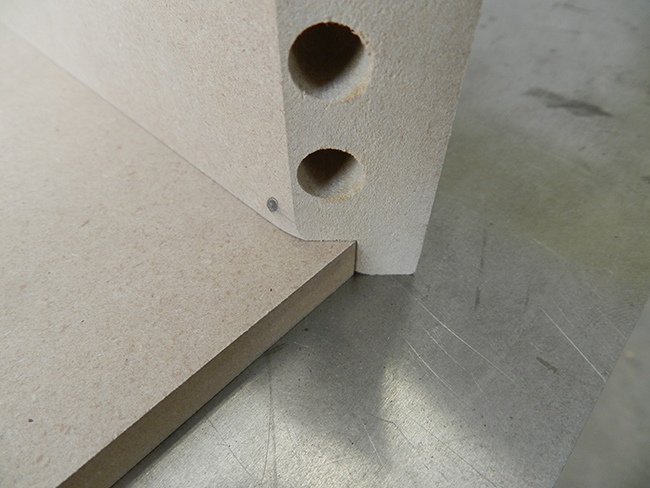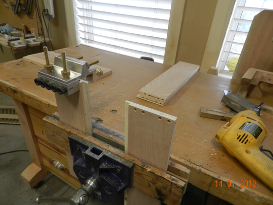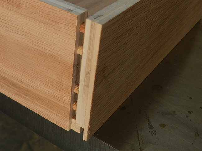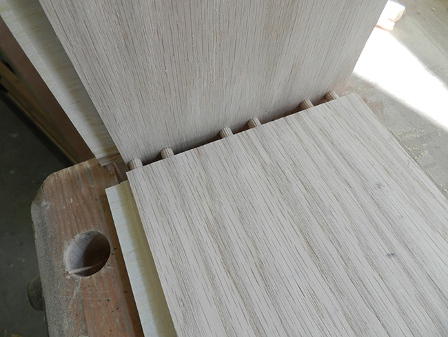 The two rear joints of this particular example will involve “blind” doweling, whereas the two front corners will represent “exposed” dowels. Since the exposed dowels protrude at 45 degrees to the longitudinal axis of the drawer wall, once trimmed, the exposed area will be ovoid in shape.