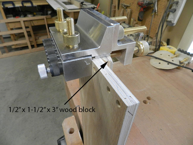 As stated, the plywood is 1/2 inch thick and following the simple formula: 1/2 inch ÷2 = 1/4 inch – 3/8 inch = minus 1/8 inch. With the negative reading we therefore have to install a 1/8 inch spacer on the lower face of the reference bracket, rather than the normal process of placing the spacer between guide block and reference bracket.