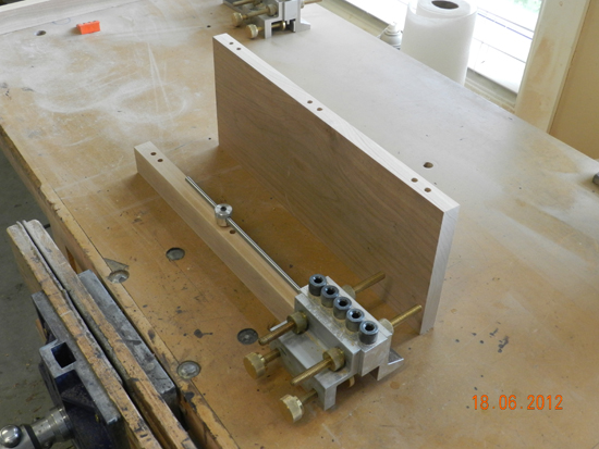 We now begin to prepare the joints on the rear face of the table. In this case we need to visually blank out the rear of the drawer, and also we require faces for the drawer slide mechanism. The upper rail is 7/8 x 7 ½ inches x 13 ½ inches long. The lower transverse rail is positioned in an identical manner to the front rail with the same dimensions, i.e. 7/8 x 1 ½ x 13 ½. Use the long distance gauge to set the position for the lower transverse rail. I drilled 8 bores to accommodate the 7 ½ inch rail which undoubtedly would be the strongest joint in creation, and overkill to a major degree. To cut down in the number of dowels we could use the distance gauge, or employ the indexing pin in a different fashion, to achieve 4 bores over the 7 ½ inch breadth of the rear rail. Proceed as follows: