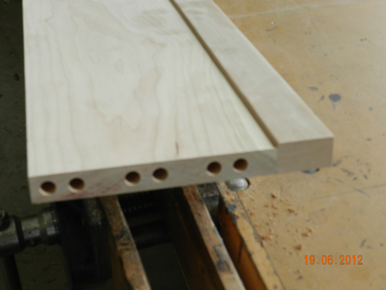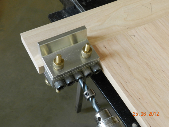 Note: when drilling the inner face of the forward rail, care has to be taken not to foul the decorative forward face, therefore we have to reduce the dowel penetration to 5/8 inch. And in order to avoid trimming dowels, we will increase the depth into the shelf to 7/8 inch.