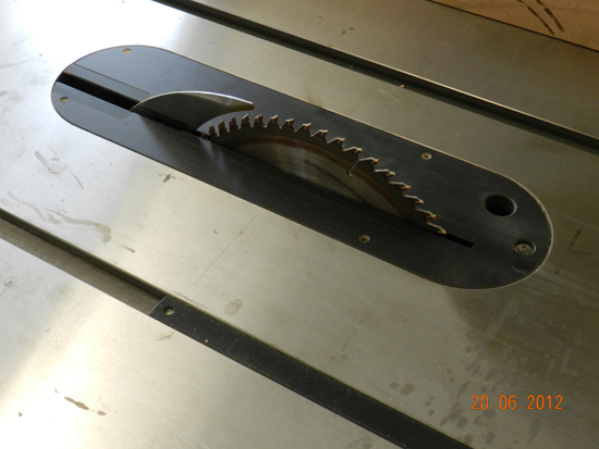 On the subject of table saws, and as an interesting aside: I have been involved in furniture design and construction for approximately 35 years, and the following is merely for the benefit of newcomers to woodworking. Several years ago I had a visit from a Dowelmax owner who wished to purchase the ¼ inch guides, and I noted he was wearing a glove on his left hand, and since it was mid summer at that time, I was somewhat mystified. He removed the glove and showed me two fingers which had been severed on his table saw, and subsequently reattached. The two digits were greyish in colour and looked far from normal. At that point in time, since I tend to be absent minded, I made up my mind to take the plunge and purchase the table saw with a solenoid stop mechanism. The unit I bought was way over engineered in my opinion, and weighed about 600 lbs. The unit cost close to $5,000. Even though this table saw was extremely expensive, the fence was an absolute disaster and required extensive modification. More recently I have become aware of two table saw accidents, both of which were caused by the same type of incident. On occasion when cutting long panels in the table saw, whether due to moisture content, internal wood stress or whatever, once the initial cut has been made, the wood tends to bow towards the centre until the two severed edges meet. This effect binds the wood, particularly at the far end of the blade, thereby causing the work piece to be driven backwards towards the operator. On both occasions mentioned, the table saw operator had their left hand extended over the blade towards the initial cut, and when the reverse surge took place, their arm or hand was pulled through the table saw blade. These were both serious injuries and could have been avoided in two ways (1), never place your hand over and beyond the rotating blade, or (2) ensure that you table saw includes a “riving” blade. Refer to photo 14