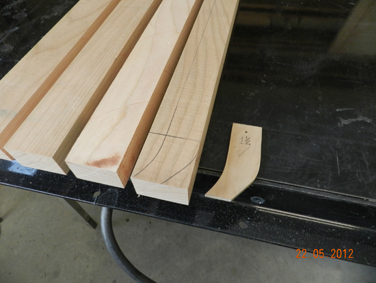 We begin with a 2 inch x 12 inch section of cherry. Cut 4 legs, 1 ½ inches+ x 2 3/8 inches x 25 inches. I have a small shaped template as shown in photo 1 to mark the lower section of the leg and to ensure that all 4 legs are identical.