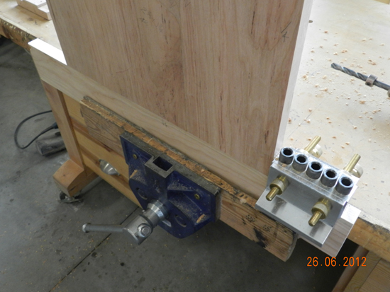 In order to achieve this, we reference and drill the outer leg and the rail as normal, using drill guides 1 and 2. However when drilling the inner vertical, we have to drill completely through that component using a backing block to prevent excessive tear out.