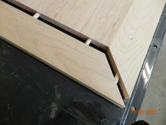 The shelf abuts against the inner side of both the forward and aft lower rails and 3 dowels at the forward and rear end will suffice for these particular joints.