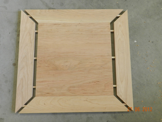 We now begin construction of the top which will measure 21 ¼” x 21 ¼”. The outer board will be 3” wide with the ends mitred. The center panel comprises 3 boards, each just over 5” wide. Mill 3 boards ¾” x 5 1/8” x 15 ½”.