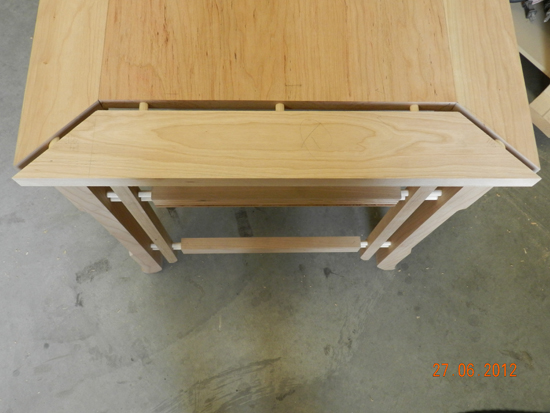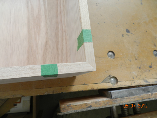 To facilitate final finishing, disassemble all sections and lay out flat. Cover dowel holes and surfaces to be glued with painters tape. Place the tape carefully so that when the various components are joined, no bare unstained surfaces are visible. For cherry I use a conditioner made up from shellac and methyl hydrate , 1 part shellac to 3 parts methyl hydrate. Apply conditioner liberally with the grain, rub in and leave overnight.