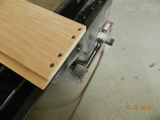 If all three work pieces are drilled in the same setting of Dowelmax, all three will be absolutely flush when complete. However it would be more aesthetically pleasing to have a “relief” with respect to the leg. This relief could be 1/8, ¼ or 3/8, and we have chosen to use the 3/8 spacer to give an exact 3/8 relief.