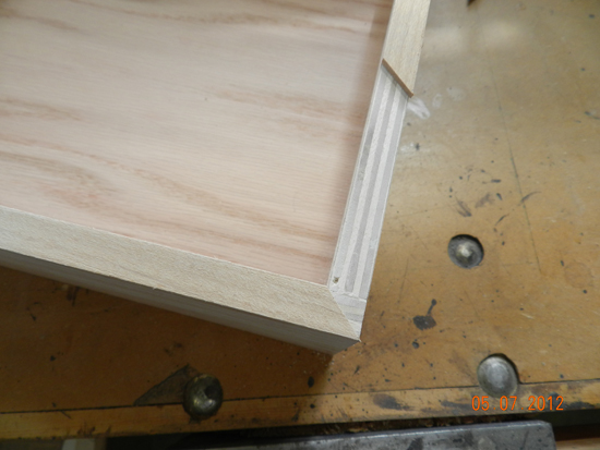 The drawer is constructed from oak faced plywood, ½ inch thick. The top edges are capped to hide the plywood laminate.