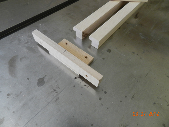 Once drilling of all 4 legs has been completed, we now trim the 2 side rails to the proper dimension, i.e. 15 ¼ inches. This can be done in the mitre saw using the shop made stop as described, to ensure identical lengths. Ensure that the saw is cutting absolutely “true”, trim 2 sides, then install the work pieces butting up against the shop stop and trim the second two ends.