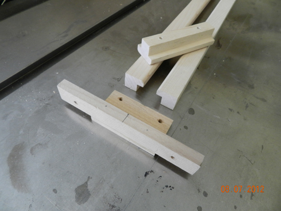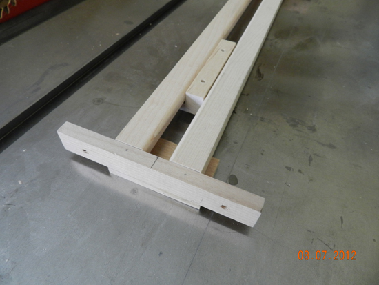 Begin by cutting the 3 forward transverse rails, all of which are 7/8 x 7/8 x 1 ½ x 13 ½”. Once again, check the mitre saw for truth, and use the shop made stop to ensure that all 3 rails are identical in length.