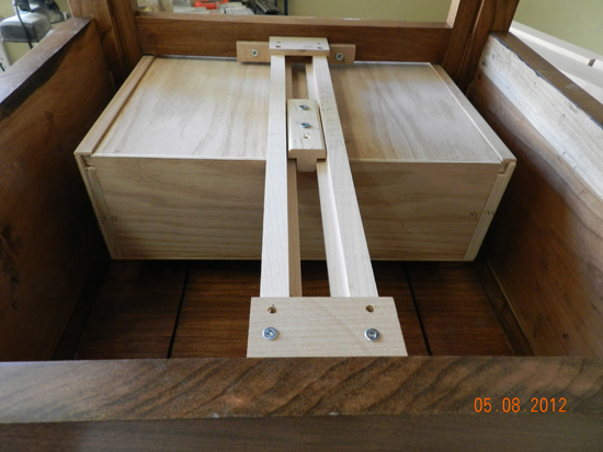 Construct and join 4 support assembly measuring ¼ inch x 1 ½ x 2 ½ inches and 3/8” x ¾” x 5 ¼ inches. Secure and glue together, then secure the assembly to the underside of the tracks, using screws. A small section of the Richelieu rail is cropped to provide the runner and 2 centre bores are drilled, then screwed to the underside of the drawer.