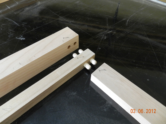 Assembly: I use a small stiff artists paint brush to apply the glue, coating the inner periphery of the holes, the exterior of the dowels, and the mating surfaces. Try to avoid excess coating, however if excess seeps out it is much easier to clean off finished surfaces than bare wood.