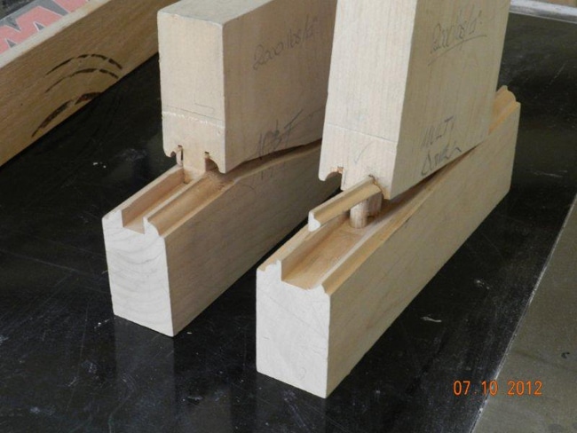 Size for size, I would virtually guarantee that this is one of the strongest structures of this type. Several years ago, after building a 1 3/4 inch thick alder front door for our new house (see pictures on our web site), we decided to test one joint to destruction, and at the same time, compare the failure point of a mortise. We were pleasantly surprised, both joints failed at exactly 2,000 lbs. per square inch. One thing I would like to point out though, in that test, the dowels were 3/8 inch in diameter, whereas the mortise was 5/8 inch (please refer to photograph). I would suggest that this again proves that the multi dowel joint is stronger than a comparable mortise and tenon.