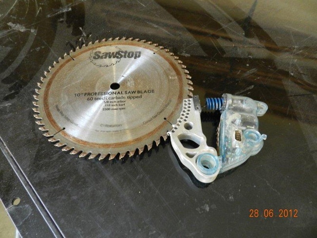 At this point I would like to relate a short story about an incident that occurred approximately 2 months ago. I have mentioned before about the gentleman who turned up at my office in North Vancouver to purchase the quarter inch Dowelmax kit, and he had shown me two fingers that had been severed and reattached surgically following a saw mishap. That factor later made me give considerable thought to buying the Sawstop table saw. At that time only the large model was available and the cost was approximately $5,000. I purchased the Sawstop about 4 years ago, just as we were moving to Kelowna and quite frankly I have always had some doubts about the validity of their claims. But obviously there was no way to test their claims without destroying the solenoid brake and a blade.