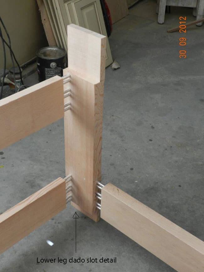 With the dado blade in, I also cut slots at the inner face of the lower legs, in order to insert 2 – 2 inch x 5 ½ inch x 28 inch transverse rails to support the castors (I designed the lower legs in this manner in order to avoid external protrusions which could impede the workbench user.)