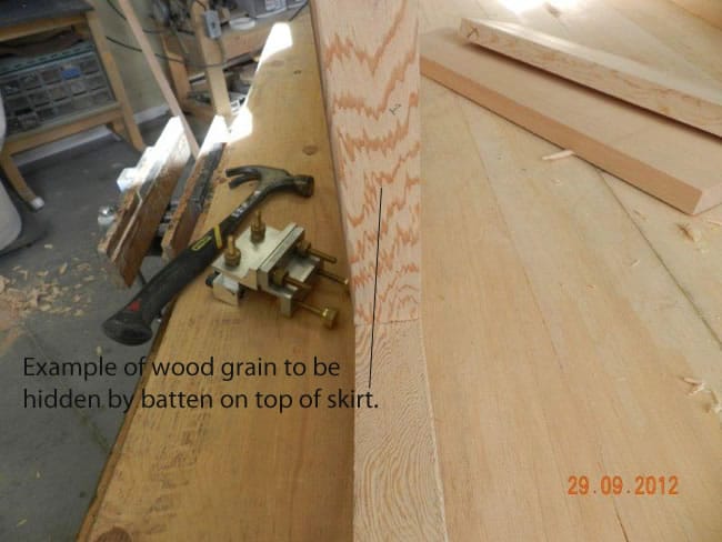 It could be noticed from the photographs that I have installed a 3/8 inch x 1 3/4 x 68 inch length of batten along the edge of the 2 upper longitudinal rails. This is probably adding an unnecessary complication, however I did it for a good reason. When this wood was milled at the yard, the grain was noted to be fine and very attractive. However the edge grain was gaudy, and this would show around the complete periphery of the workbench. A secondary consideration was that the termination of the 4 half laps would also be visible on the top of the bench. However we have to remember that it is a “work” bench and a beginner may want to ignore those minor cosmetic drawbacks.