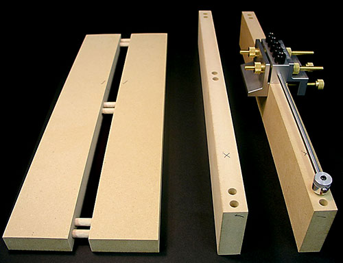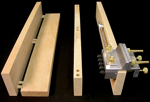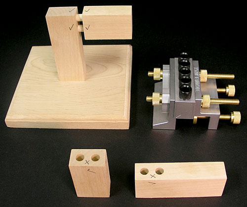 This picture shows how the Dowelmax is designed to allow for equidistant spacing of two 3/8 inch dowels in a standard 3/4″ x 1-1/2″ work piece for building rigid 1×2 furniture frames. An example of an application of this multiple dowel wood joint configuration is the diy display cabinet frame shown on the Dowelmax furniture page.