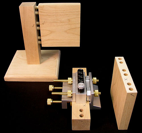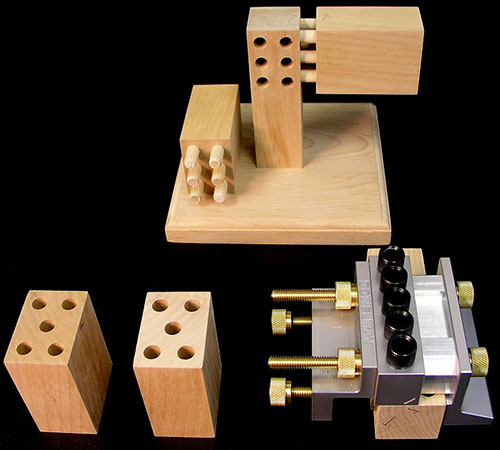 This picture shows a 2-1/4×2 to 2×2 multiple dowel woodworking joint configuration using the 3/8 and 3/4 inch spacers to create accurate, snug and strong double or triple row multiple dowel joints used for building furniture where increased wood joinery strength or load distribution is required. An example of an application for this multiple dowel wood joint configuration is a do it yourself chair.