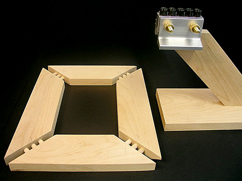 This picture shows a 1×4 to 1×4 multiple dowel woodworking miter joint configuration used for building furniture like a coffee table top or dining table top with glass or wood inset or for building picture frames. The edge of the Dowelmax reference block is set flush with the outer point of the mitered corner as shown on the right. Wood joinery surfaces can be made flush within .002 inches. An example of an application of this multiple dowel wood joint configuration is the coffee table top shown on the Dowelmax furniture page.