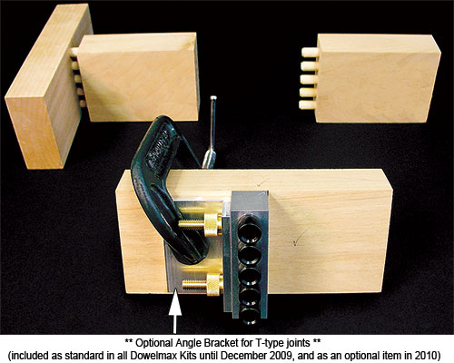 This picture shows an edge to face multiple dowel woodworking joint configuration which is ideal for building a do it yourself cabinet carcass. The Dowelmax clamp bracket is relocated to the underside of the reference bracket to change to the face wood joint configuration to create the face joint as shown. The Dowelmax shown in the example is shimmed with two 1/16 inch shim washers for use on 7/8 inch thick wood joinery. An example of an application of this multiple dowel wood joint configuration is the diy face frame cabinet carcass shown on the Dowelmax furniture page.