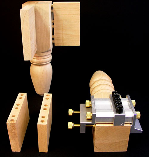 This picture shows a 1×6 to 2×2 multiple dowel wood joint configuration used for building furniture like a do it yourself end table, using the 3/8 inch spacer to create a 3/8 inch offset and the index pin to extend the dowels along the wood joint work piece. An example of an application of this multiple dowel wood joint configuration is the end table frame shown on the Dowelmax furniture page.